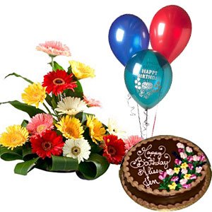 3 Balloons+ Chocolate Cake + Mix Gerberas Basket3 Balloons+ Chocolate Cake + Mix Gerberas Basket