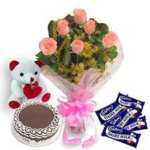 Bithday Celebrate w/loveCelebrate her special day with a gift of love.send her a flower(1dozen pink rose bouquet),5 pcs cadbury 65 g each and a cake , 8 " small teddy to make it a remarkable one.