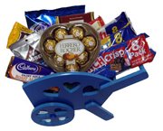 Chocolate Basket-3Heart ferrero, Cadbury Roast Almond, Kisses Milk Chocolates, M & M's, Ritter Sport raisins & Hazelnuts, Crunch Crisp, Butter Finger, Baby Ruth, Kit Kat Bar, Cadbury.