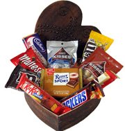 Chocolates in a heart boxIncludes: Kit kat, Snickers Almond Bar, Maltese, M&M, pack Kisses, Ritter Sport, Cad bury.(10 items)