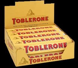 Toblerone Milk 50gA box of 20 pcs A box of 50g Swiss milk chocolate bars with honey and almond nougat.