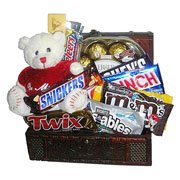 Bear w/ ChocolateHeart shape Fererro Rocher, Toblerone, M&M and other item of chocolate. Total 10 items foreign chocolate with 14" Teddy Bear with i love you pilow.