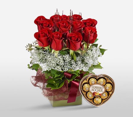Blooming LoveThe classic symbol of love for over 400 years, these carefully selected 12 red roses along withy baby breaths are well wrapped and tied with a bright ribbon in a basket along ferrero chocolate.