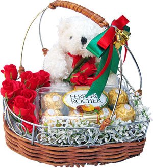 Celebrate the dayBasket of 12 Red Roses and 16 Pcs Ferrero Rochers Chocolate Box with 6 Inches Teddy Bear.