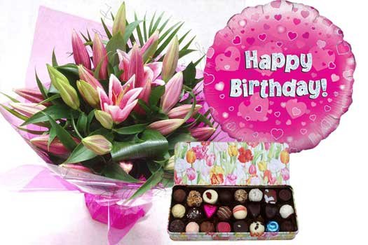 Flowers, Belgian Chocolates and BalloonPink Happy Birthday Gift Package - Flowers, Belgian Chocolates and Balloon chocolates 100 gm