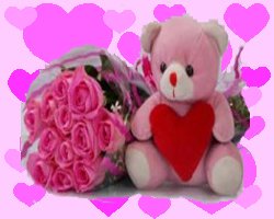 Pretty pink LoveBunch of 12 Pink Roses along with 9 Inches pink Teddy Bear and heart pillow.