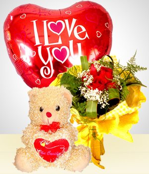 Tenderness Combo6 Roses Bouquet + Balloon + Teddy Bear "To say "Sorry," I love you "or just" I'm with you ". Super romantic offer of: -6 roses bouquet -A I LOVE YOU balloon 24 inches teddy and PIlLow -A teddy bear specially for the occasion.
