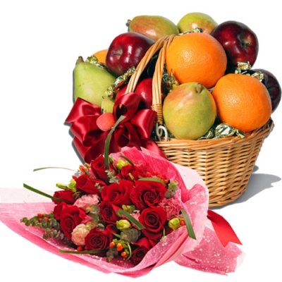 6 items Fresh Fruit Basket w/ 12 red roses
