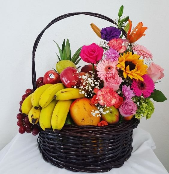 Gentle SweetnessDescription This mixed fruit basket is graced by an arrangement of pink lilies, gerbera and roses standing elegantly by. Pink Lily, Gerbera, Roses & Fruits Basket Arrangement