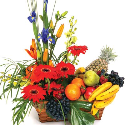 Home On The RangeYour recipient will feel right at home with this humble and yet striking arrangement. Let the basket of fruit express your get well wishes, while the subtle hues of pink and purple blooms soothe and comfort. 6 Gerbera, 3 pcs Pink lilies And Wax Flowers With Assorted Fruits ( 6 item).