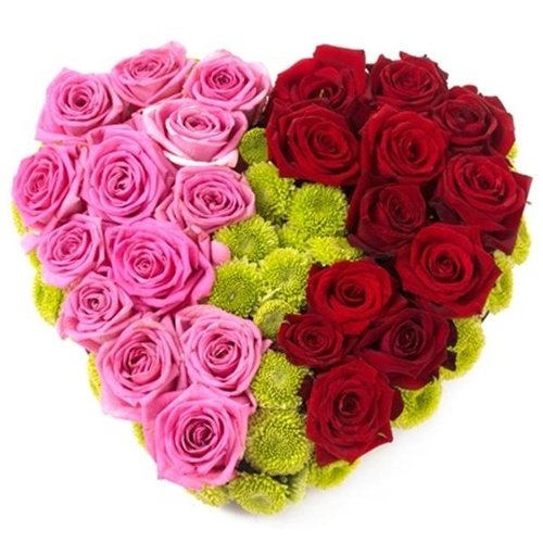 Love In Bloom Heart-Shaped flowersWith its charming colors and rich fragrance, the bouquet is sure to make someone's wishes come true! Our florists hand-arrange the stunning floral arrangement that features a select mix of fresh-cut 18 pink and 18 red lush roses and richly colorful chrysanthemums.
