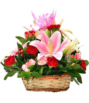 Happiness Harbor2 pink lilies, 2 white lilies, 10 red carnations, 12 pink carnations, green leaves and pink bowknot tied basket. Available for birthday, get well, festival and bestwishes. - Order 24 hours ahead.