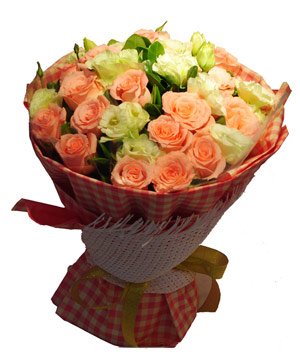 Honorable19 pink roses match eustoma grandiflorum (or white roses) and green, hand-tied bouquet.