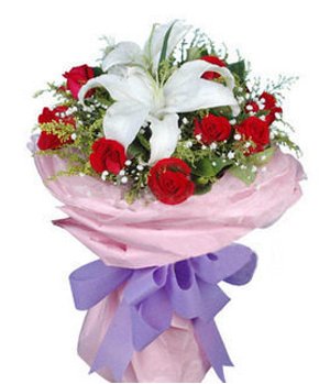 My Angel2 white lily,11 red rose. Pink hands knead paper packaging, the external screen, pink, purple butterfly finished bouquet.
