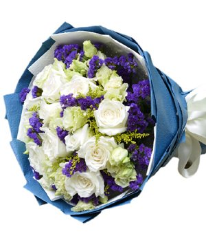 Secret Obsession11 premium white rose bouquet, forget-me-not and grandiflorum decorated. Wraps with white and blue crepe paper, ties white bowknot.