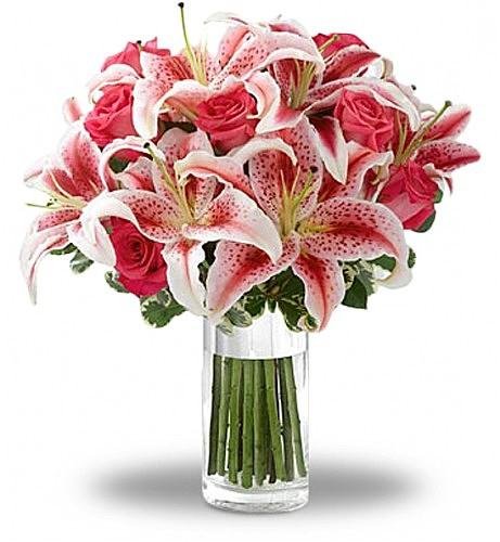 SIMPLE ELEGANCEBoth simple and elegant, this bouquet includes the classical pink roses and stargazer combination, which never fails to bring joy to the receiver.