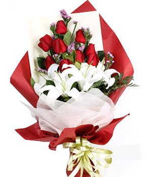 Special Gift9 stem red roses, 2 white lilies, forget-me-not and green leaves decorated. Red and yellow, pink paper wraps.