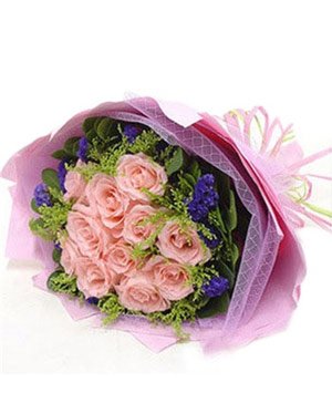 Sweet Moment11 pink roses match solidago canadensis and dont-forget-me. Double layer pink crepe paper packing, pink ribbon the bottom.