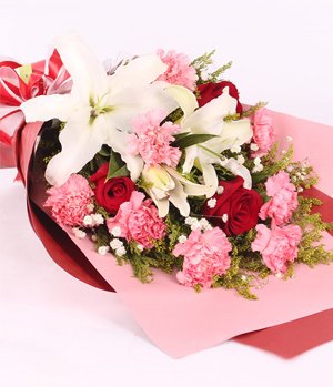 The Root & Green LeavesMixed hand bouquet includes 8 pink carnations, 2 stalks white perfume lilies and 3 stem red roses for express affection like the root and the green leaves.