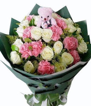 white roses+pink carnations11 white roses, 12 pink carnations, green leaves, a small teddy bear sit on bouquet, available for Great love, as wells as for mother annd elder women