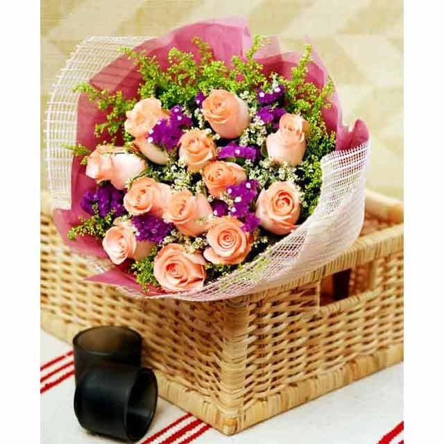 12 NIGHTS TO LOVE12 stalks of pink roses hand bunch with Statics and Caspia