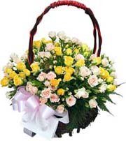 Two Dozen mix rosesA super large yellow & white Basket consisting of 24 freshly cut Long Stemmed Roses & pink Ribbon.