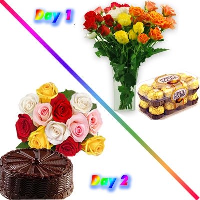 Colorful DreamsGive Colorful surprise to your near and dear one with this 2 Days Serenade which includes : Day 1 feb 13: 12 Multi color roses nicely arranged in a vase + Ferrero Rocher Chocolate Box (Net Weight : 200 gms). Day 2 february 14 : Bunch of 18 Multi Color Roses + 1/2 kg Chocolate Cake.