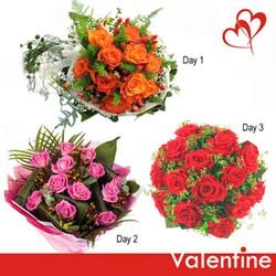 Shower Ur LoveDay 1. Buch of 12 Orange Roses.( Dely on 12th Feb) Day 2. Bunch of 12 Pink Roses. ( Dely on 13 th Feb ) Day3. Bunch of 12 Red roses. (Dely on 14th Feb)