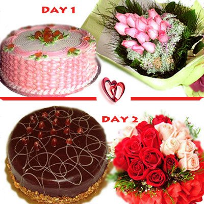 Two Days ComboSend fresh roses to your sweet valentine & express everything what you want to say. Hamper includes two days package: Day 1-feb 13 : 12 pink roses bunch with 1/2 Kg mocha cake cake design may vary DAY-2 feb14: 12 red & pink roses bunch along with 1/2 Kg chocolate cake. cake design may vary-